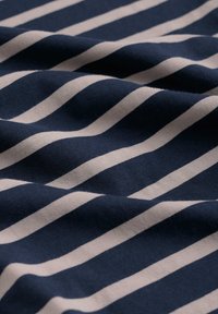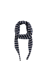 Groen gebreide trui met geribbelde manchetten en zoom, gecombineerd met een gestreepte marineblauwe en witte sjaal. Achtergrond is neutraal van kleur.