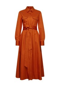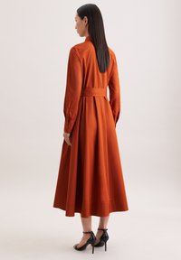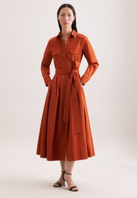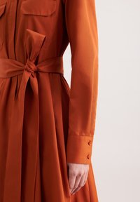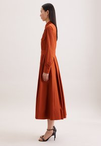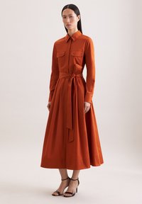 Vrouw draagt een roestoranje jurk met lange mouwen, borstzakken, taillekoord, geplooide rok en zwarte enkellaarzen met riempjes, staand tegen een neutrale achtergrond.