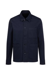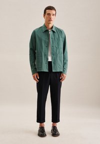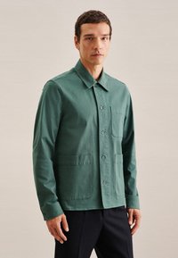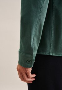 Groene katoenen jas met een knoopsluiting aan de voorkant, kraag, twee voorzakken en lange mouwen. Heeft een gladde textuur en een getailleerde pasvorm.