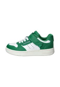 Rode en witte sneaker van synthetisch leer, met een klittenbandsluiting, zwarte veters, geperforeerde details en een witte rubberen zool.