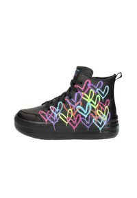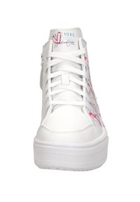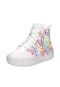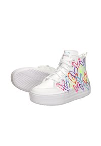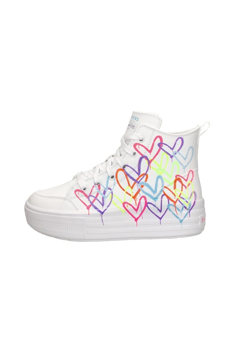 Witte hoge sneakers met hartpatronen in meerdere kleuren, met een getextureerde zool en vetersluiting. Verstevigde hak en logo-detail.
