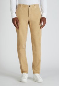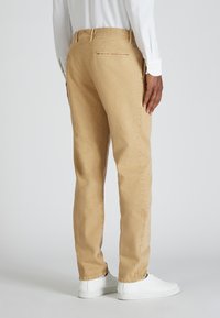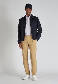 Man in beige rechte-pijpbroek, witte lange mouwen shirt en witte sneakers, staand tegen een effen grijze achtergrond.
