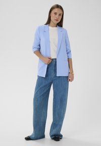 Lichtblauwe blazer met een getailleerd ontwerp, revers met inkeping, opgerolde mouwen en een enkele voorzak, gecombineerd met een wit t-shirt en spijkerbroek.