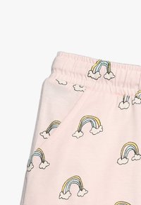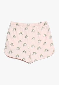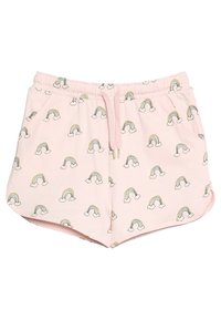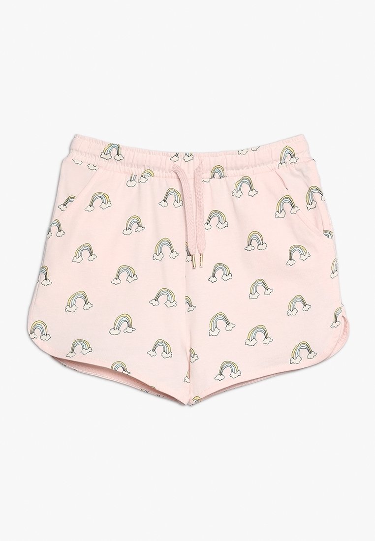 Roze shorts met een herhalend patroon van regenbogen en wolken. Gemaakt van zachte stof, met een elastische tailleband en trekkoord voor een verstelbare pasvorm.