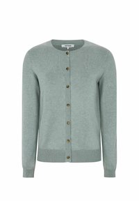 Lichtgrijze cardigan gemaakt van zacht materiaal, met een ronde halslijn, lange mouwen en bruine knoopaccenten aan de voorkant.