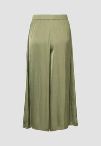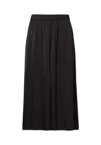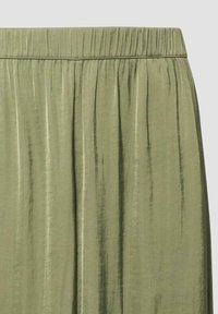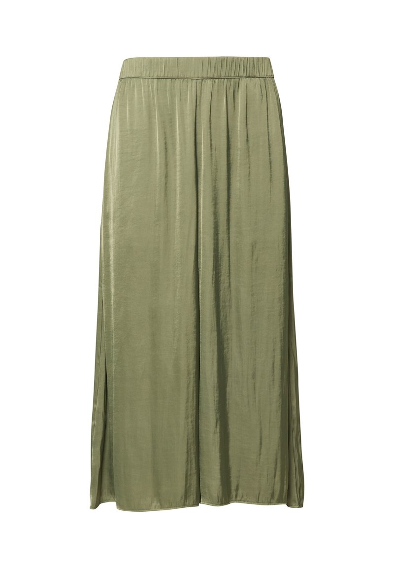 Olijfgroene midi-rok met elastische tailleband en zijsplitten, gemaakt van glad, glanzend stof.