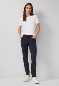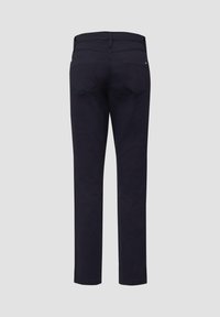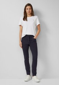 Vrouw draagt nauwsluitende donkerblauwe broek met trekkoord in de taille en witte sneakers, staand tegen een effen lichtgrijze achtergrond.