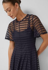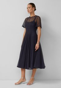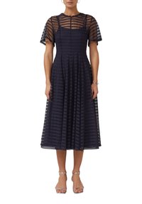 Vrouw draagt een marineblauwe midi-jurk met transparante gestreepte overlay, korte mouwen en zilveren enkellaarsjes met bandje, staand tegen een effen grijze muur.