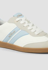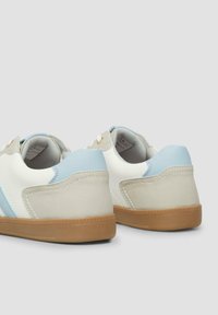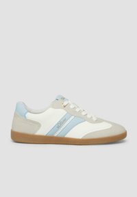 Witte sneaker met beige en lichtblauwe accenten, rubberen zool, veters aan de voorkant en merknaam op de zijstreep.