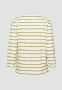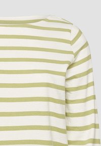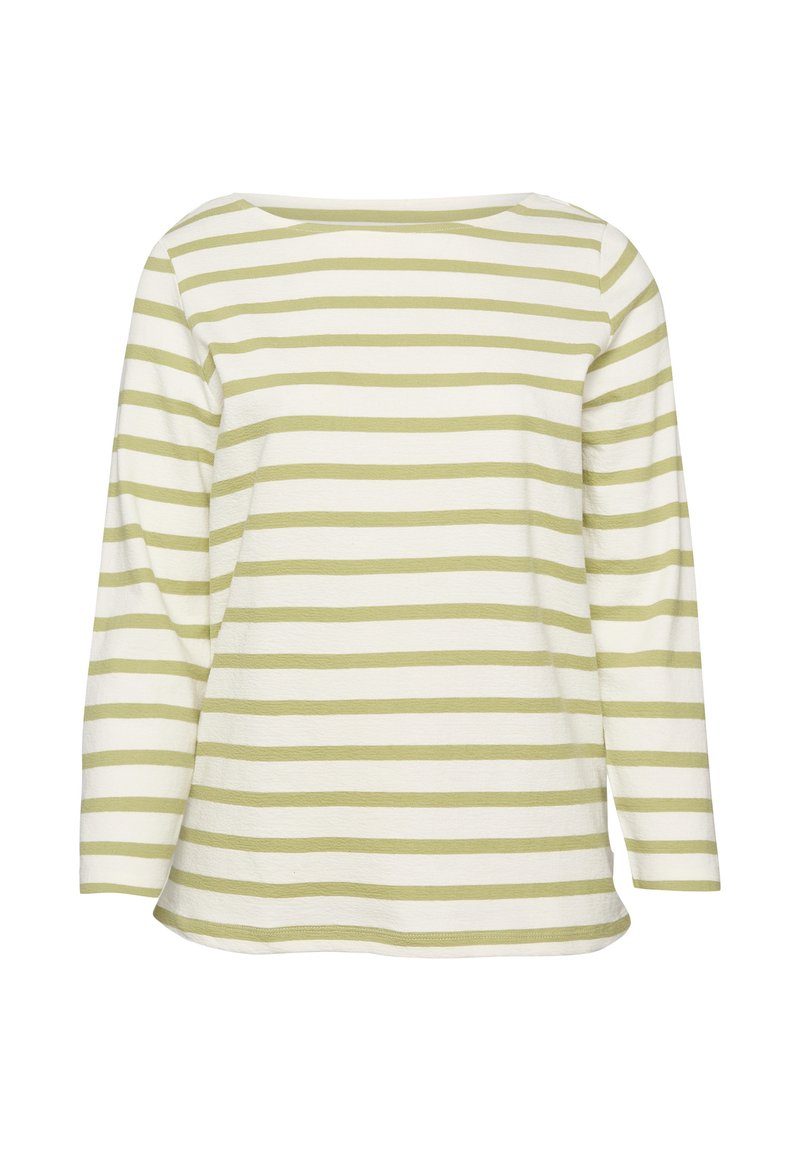Een shirt met lange mouwen, witte en lichtgroene horizontale strepen en een ronde hals, afgebeeld op een witte achtergrond.