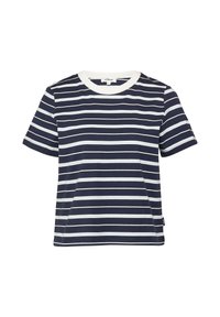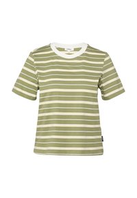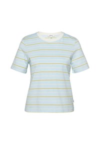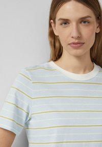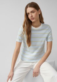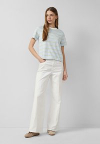 Jonge vrouw met lang lichtbruin haar, gekleed in een lichtblauw met gele gestreepte shirt met korte mouwen en een witte broek, staand tegen een grijze muur.