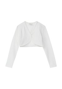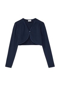 Marineblauw cropped vest met lange mouwen, knoopsluiting aan de voorkant en een afgeronde zoom. Gemaakt van zachte, rekbare stof.