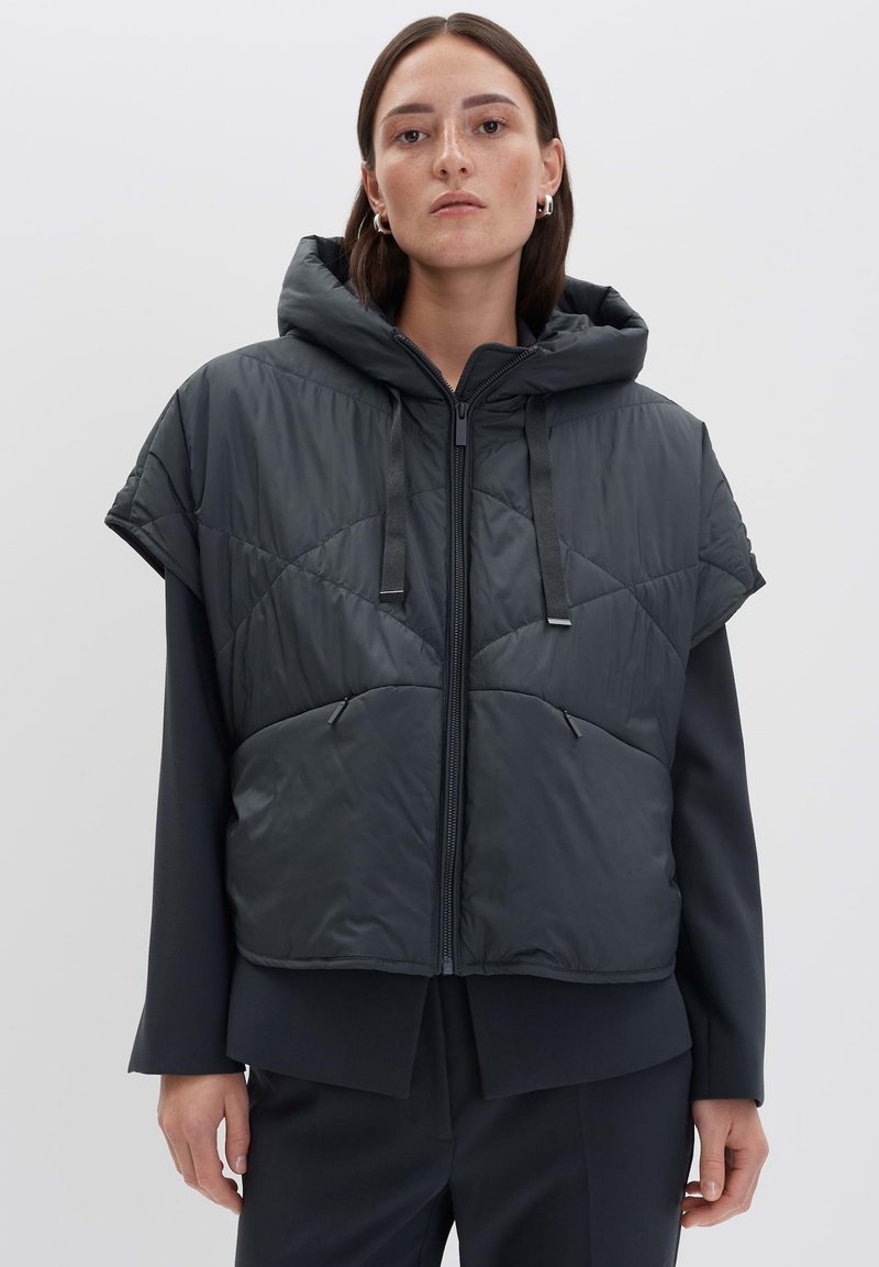 Zwarte, gewatteerde mouwloze jas met capuchon, voorzien van een quilted design, een ritssluiting aan de voorkant en verstelbare trekkoorden op de capuchon.