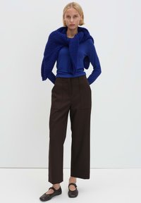Bruine wijde broek met steekzakken aan de voorkant, gemaakt van een gestructureerde stof. Gecombineerd met een blauw top met lange mouwen en zwarte platte schoenen.