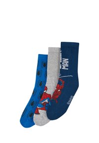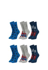 Twee sets van elk drie Spider-Man themasokken: blauw met zwarte spinnen, grijs met een Spider-Man afbeelding, en donkerblauw met de tekst "SPIDER-MAN" en een webdesign.