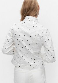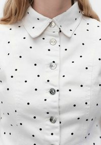 Vrouw die een wit jasje met zwarte polkadots en bijpassende witte broek draagt, staand tegen een effen witte achtergrond.