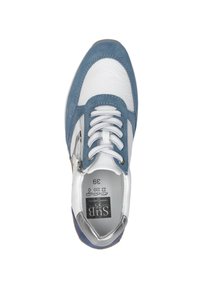 Lage sneaker van blauw suède, witte leren panelen, zilveren accenten, witte veters, zijrits, kurken tussenzool en geribbelde rubberen buitenzool.