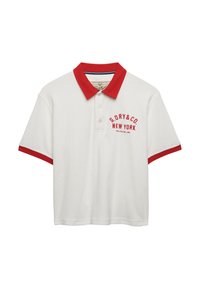 Gesneden marineblauw poloshirt met witte kraag en mouwboorden, met "S.D.R. N.Y." borduursel op de borst, zachte gestructureerde stof.