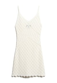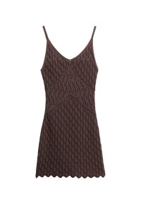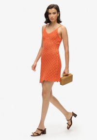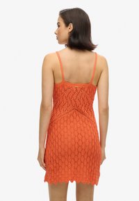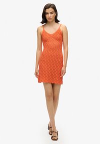 Gehaakt oranje jurk met een gegolfd patroon, spaghettibandjes en een aansluitende pasvorm. Textuurmateriaal creëert een open geweven ontwerp.