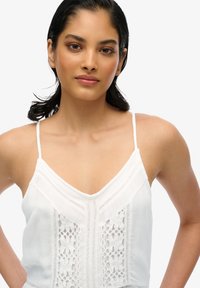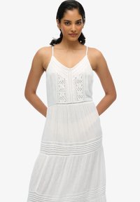 Witte maxi-jurk met verstelbare spaghettibandjes, kantdetails op het lijfje en horizontale plooien. Model draagt bruine sandalen.