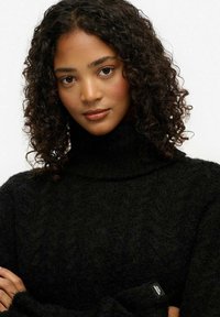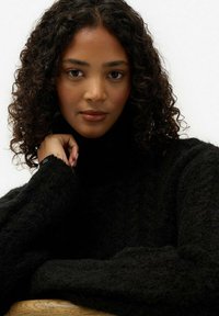 Vrouw met krullend haar, gekleed in een zwarte kabelgebreide coltrui en lichtblauwe spijkerbroek met een zwarte riem, poserend met één hand in de zak.