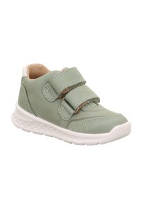 Lichtgroene kinderschoen van leer met gaaspanelen, twee klittenbandsluitingen, witte rubberen zool en een kleine neonaccent op de hiel.