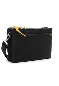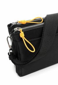 Zwarte rechthoekige crossbodytas met verstelbare band, gele ritstrekker, voorvak en klein logolabel op witte achtergrond.