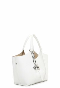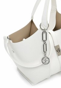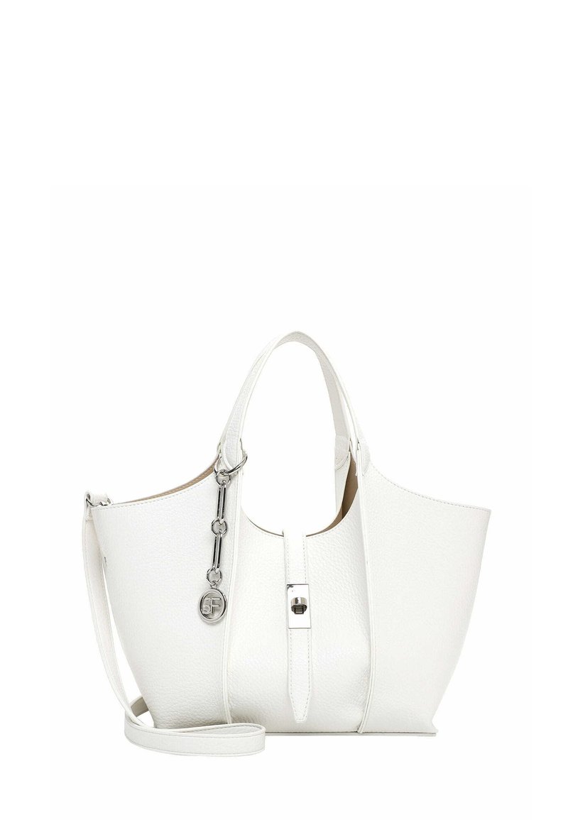 Witte gestructureerde leren handtas met korte handvatten, een afneembare schouderriem, een zilveren gesp en een ronde zilveren bedel aan een ketting.