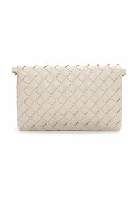 Crème-kleurige geweven leren clutch met logo plaquette in goudkleur en afneembare polsband.
