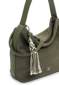 Olijfgroene gestructureerde handtas met enkele bovenhandgreep, afneembare schouderriem en decoratieve beige kwast charm.