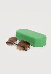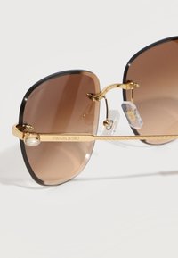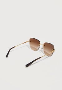 Bruine gradient vierkante glazen met dunne gouden metalen monturen en schildpadkleurige pootjes op een witte achtergrond.