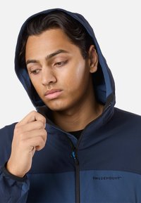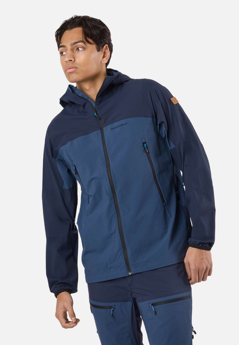 Jonge man die een marineblauwe softshell jas met capuchon draagt, voorzien van zakken met rits, en een blauwe spijkerbroek, staand met handen in de zakken.
