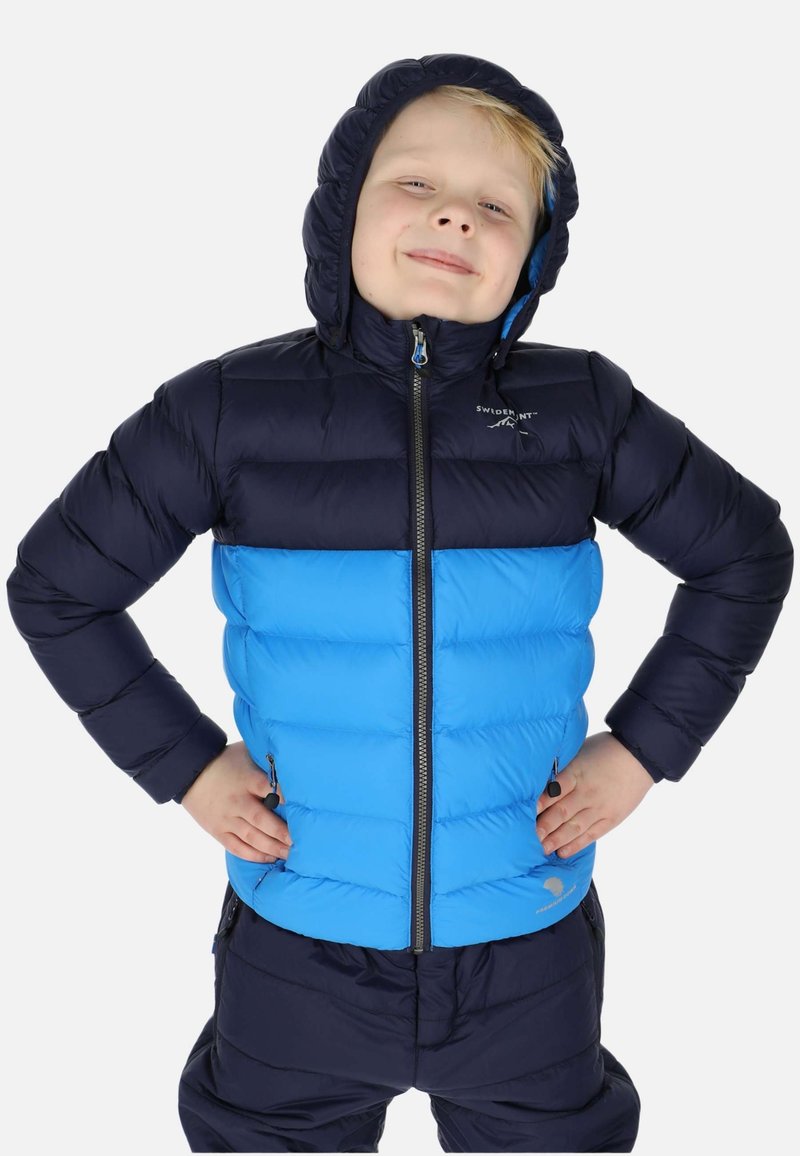 Jongen draagt een navyblauwe en felblauwe donsjas met capuchon omhoog, staat met handen in de zij en een lichte glimlach op een witte achtergrond.