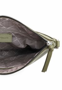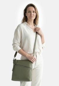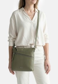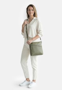 Vrouw draagt een witte outfit en witte sneakers, met een groene leren crossbodytas met ritssluiting.