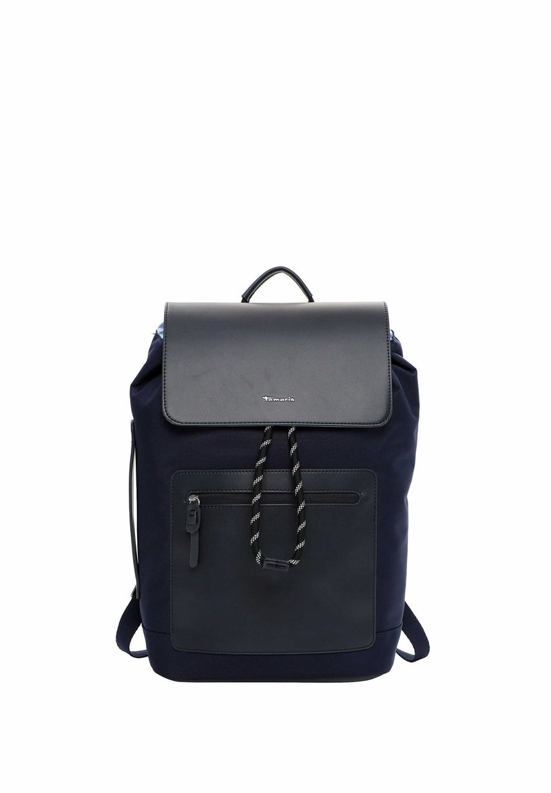 Marineblauwe rugzak met zwarte leren klep, voorvak met ritssluiting en een trekkoordsluiting met witte strepen, afgebeeld tegen een witte achtergrond.