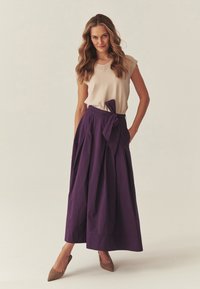 Glunderende vrouw met lang haar, gekleed in een beige mouwloos topje en een paarse rok met hoge taille en strik, poserend tegen een effen lichte achtergrond.