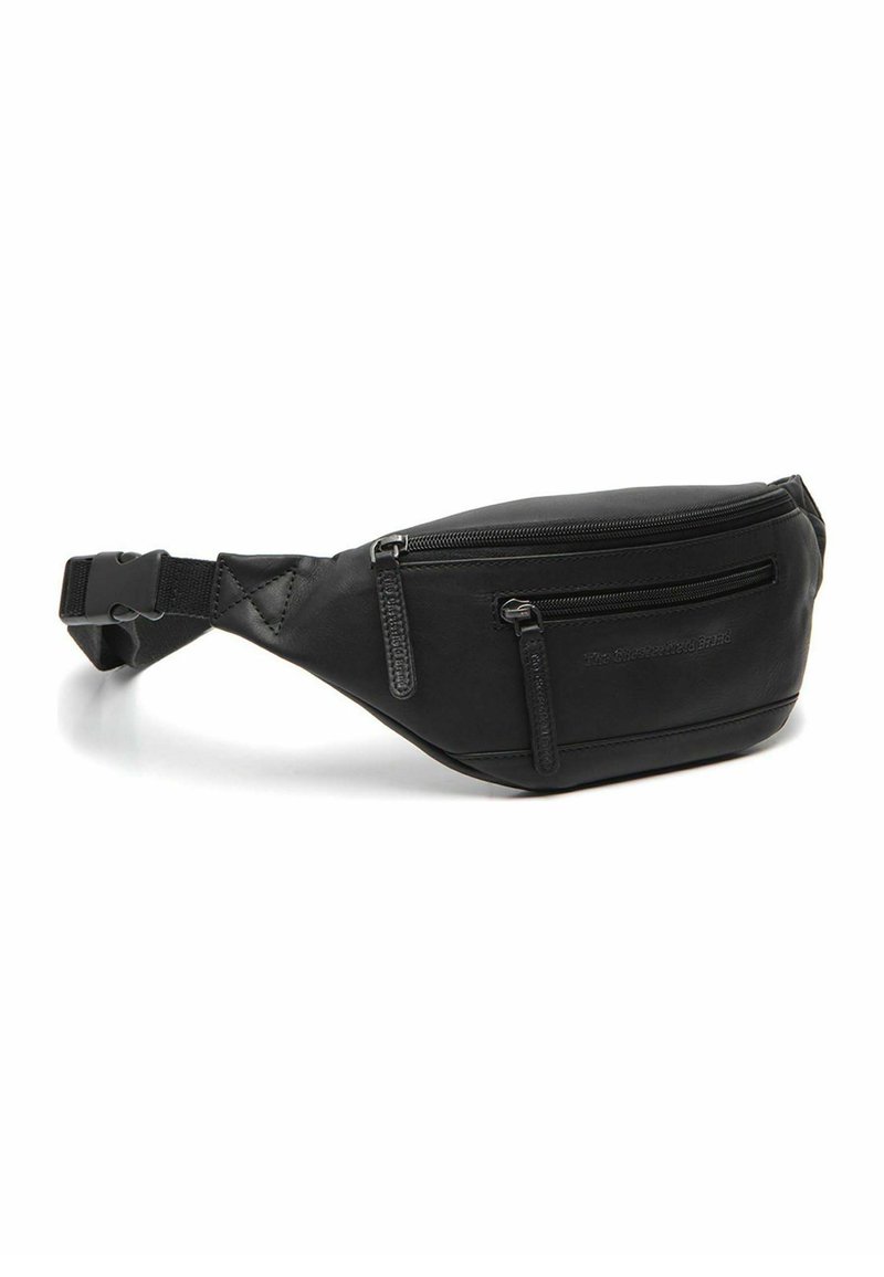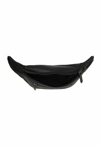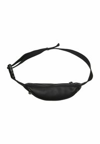 Zwarte heuptas van glad nylon, met twee zakken met rits, verstelbare band en een reliëflogo aan de voorkant.