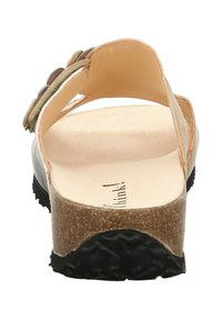 Comfortabele sandaal met kurken zool, bovenwerk van zwart en grijs gemarmerd leer, en decoratieve ronde leren patch op het bandje.