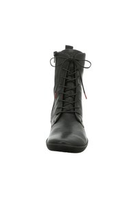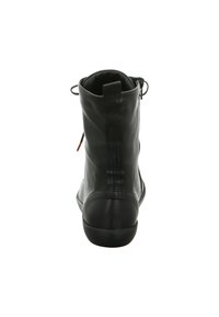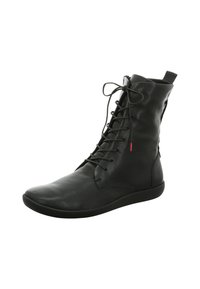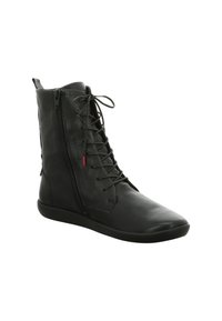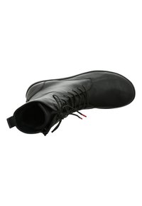 Zwarte leren enkellaarzen met een strak, glad oppervlak, ronde neus, veters aan de voorkant en een handige trekband achteraan voor gemakkelijk aan- en uittrekken.