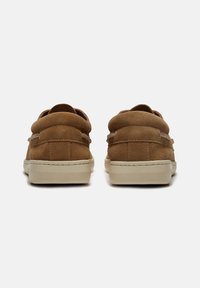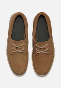Bruine suède casual bootschoen met veters, beige zool en Timberland-logo in reliëf aan de zijkant en hiel.