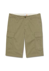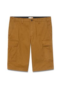 Man die bruine cargoshorts draagt, crèmekleurige laarzen met donkere kragen, witte sokken en een lichtblauw shirt, gezien van achteren.