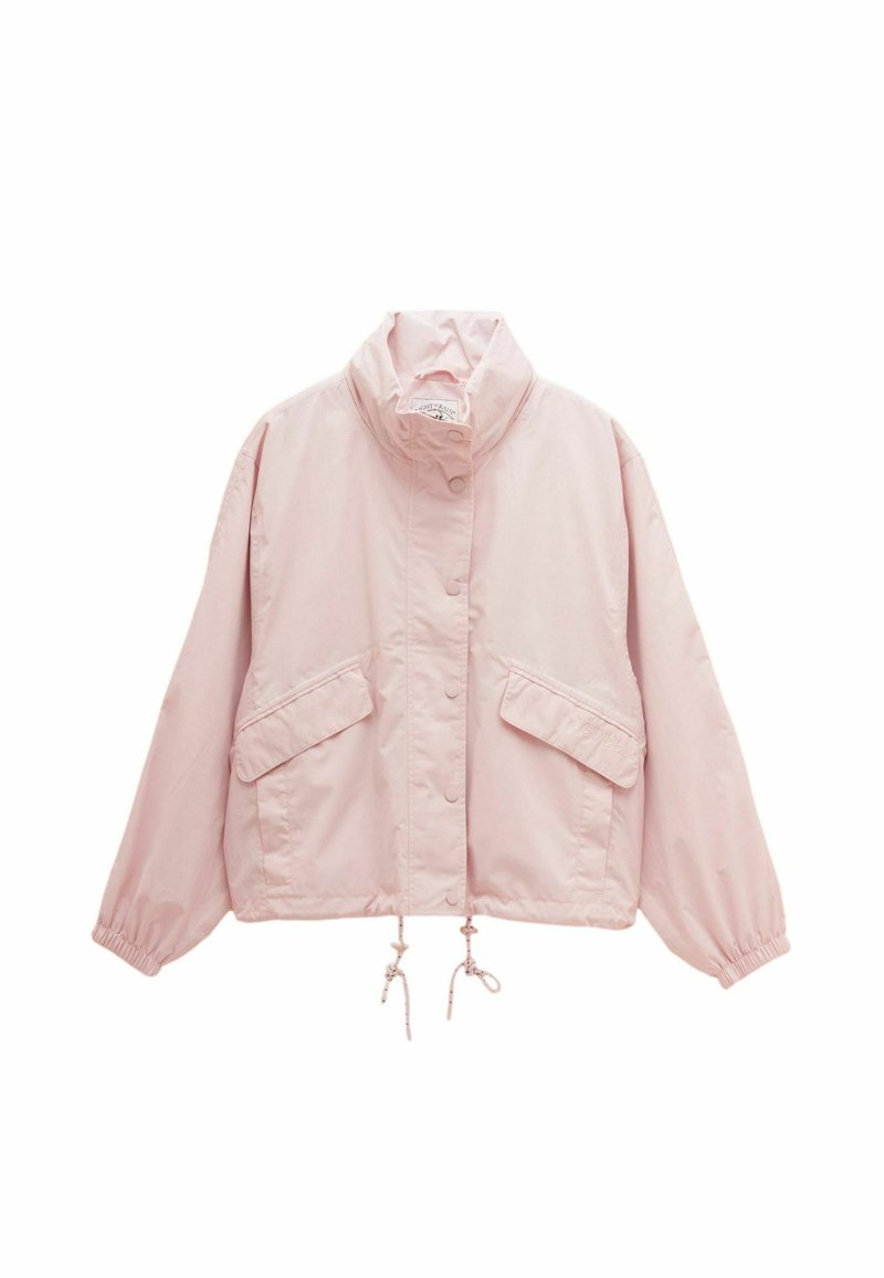 Lichtroze casual jas met hoge kraag, drukknoopsluiting aan de voorkant, twee klepzakken, elastische manchetten en verstelbare trekkoorden aan de zoom.