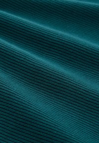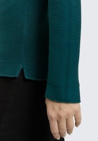 Turquoise geribbelde gebreide trui met lange mouwen en een ronde hals, met een losse pasvorm en subtiele textuur, gecombineerd met donkere broek.