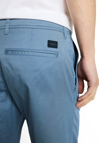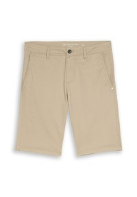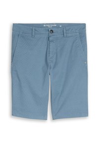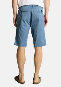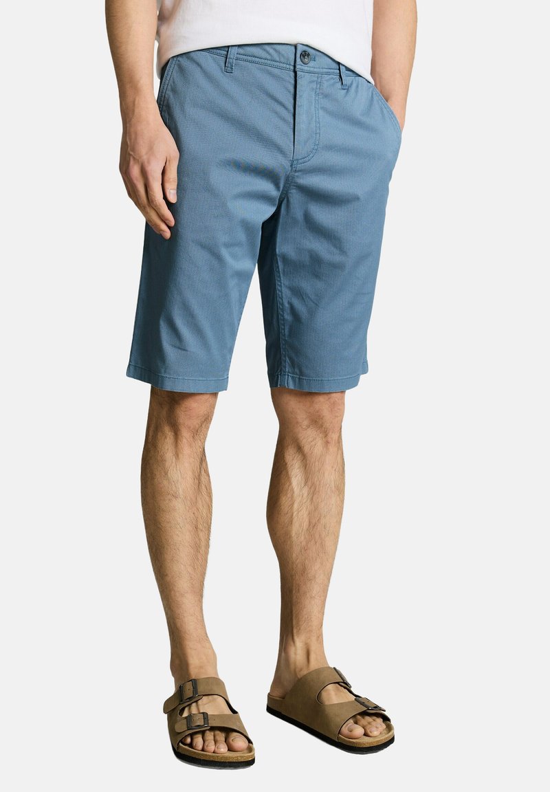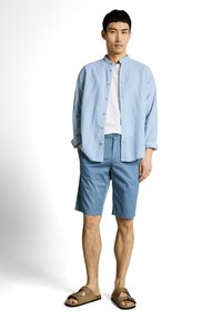 Man die blauwe knielange korte broek, een wit T-shirt en bruine sandalen met dubbele gesp draagt, staand met handen in de zakken tegen een witte achtergrond.