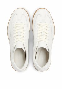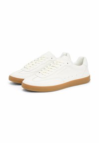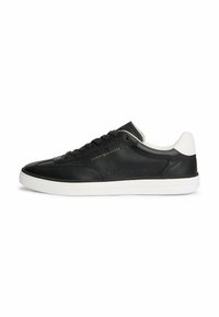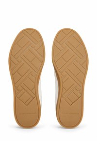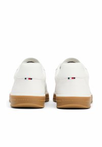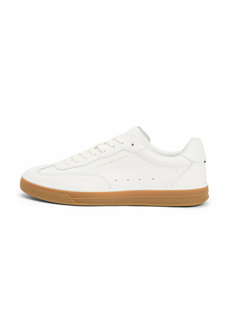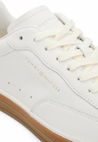Witte lage sneaker met gumzool, vetersluiting en "Tommy Hilfiger"-logo aan de zijkant.