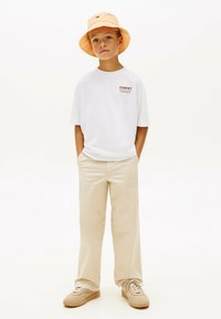Jongen met een perzikkleurige bucket hat, wit oversized T-shirt met logo, beige wijde broek en beige sneakers, staand met handen in de zakken.