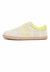 De Heritage-trainerscollectie begint met een knipoog naar onze sportieve roots. Uitgevoerd in neutrale kleuren, felle kleuraccenten en hoogwaardig suède om deze klassieke vorm trendy te houden. Deze linnen-katoenen touwtrainers, met geborduurd logo, combineren het silhouet van een espadrille met een praktische veterschoen. Hoogtepunten • Bovenwerk van geweven linnen en katoen • Voering van puur katoen • Uitneembare binnenzool van polyurethaan, andere textielsoorten en thermoplastisch rubber • Rubberen buitenzool • Panelen met gemengde textuur • Gespikkelde veters • Gestructureerde stiksels op de tussenzool • Met jute beklede tussenzool • Tommy Hilfiger-logo in borduursel op de zijkant • Tommy Hilfiger-logo Vorm en pasvorm • Laag model • Vetersluiting Samenstelling en onderhoud • 50% linnen, 50% katoen