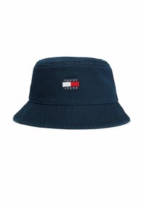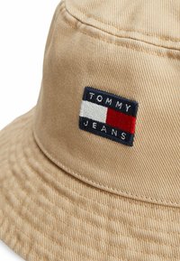 Jonge man die een beige bucket hat en een jas met Tommy Jeans-logo's draagt, kijkt recht in de camera tegen een effen witte achtergrond.