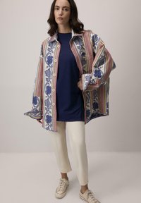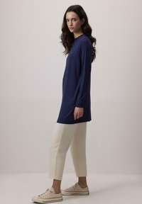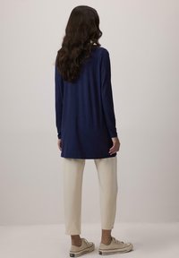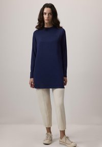 Vrouw met lang donker haar die een marineblauwe tuniek met lange mouwen draagt, staand met één hand op de heup tegen een effen lichte achtergrond.