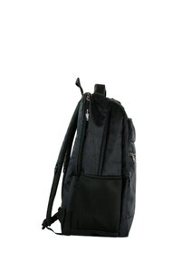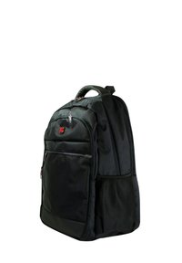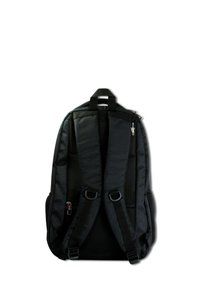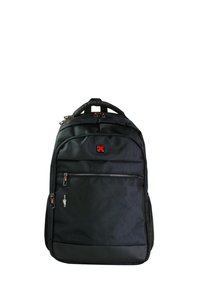 Zwarte stoffen rugzak met meerdere ritsvakken en een klein rood-zwart vierkant logo gecentreerd nabij de bovenkant.